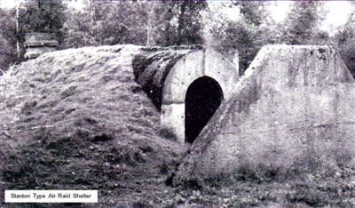 There were many forms of Air Raid Shelters. The early type being a crude covered slit trench. These were soon superseded by precast concrete shelters ( Stanton Type ) each holding twenty five to fifty people. Concrete precast sections were bolted together to form the required length, then covered with earth for bomb splinter protection. At one end was an entrance, shielded by a blast wall. At the other end was a wall mounted ladder leading up to an escape hatch.