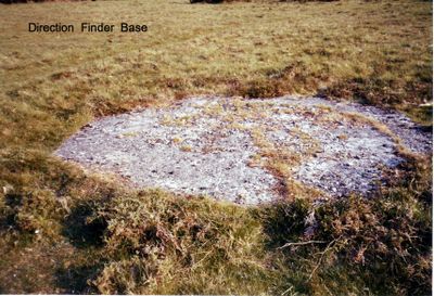 The ' Compass Base ' at R.A.F. Harrowbeer consists of a round concrete base thirty feet in diameter with a central bronze pin level with the top of the base. There would have been a circular ring fixed in the ground at sixty feet diameter to the bronze pin which would of had the points of the compass marked on or fixed to it.